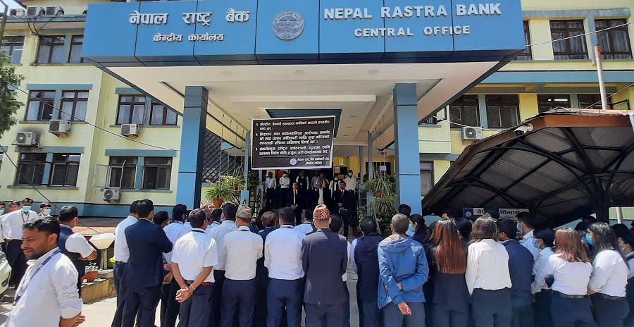 सरकारले नेपाल राष्ट्र बैंकका गभर्नर महाप्रसाद अधिकारीलाई गरेको निलम्बनको विरोध गरिएको छ । राष्ट्र बैंक कर्मचारी संघ केन्द्रिय समितिले बैंकको केन्द्रीय कार्यालय बालुवाटारमा कालो ब्यानर झुण्ड्याउँदै विरोध जनाएको हो ।