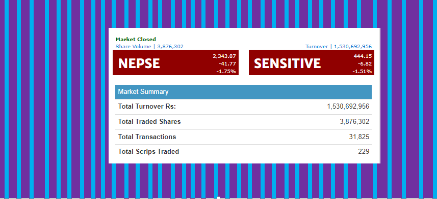 सेयर बजार ओरालो लाग्नेक्रमले सोमबार पनि निरन्तरता पायाे । नेप्से सूचक ४१.७७ अंकले घटेर २३४३.८७ विन्दुमा आएको छ । १ अर्ब ५३ करोड रुपैयाँभन्दा बढीको सेयर कारोबार भएको छ । नेप्सेले दिनहुँजसो तल्ला विन्दुहरु छोइरहेको छ । जसका कारण बजारमा सेयर भाउ निकै सस्तो भइसकेका छन् । यसबीचमा लगानीकर्ताहरुले बजार पुँजीकरणका आधारमा खरबौं रुपैयाँ गुमाइसकेका छन् । राष्ट्र बैंकको गलत नीतिका कारण सेयर बजार यसरी प्रभावित भएको हो । सेयर बजारलाई नै प्रत्यक्ष असर गर्ने गरी केन्द्रीय बैंकले एकपछि अर्को नीतिहरु जारी गर्यो ।