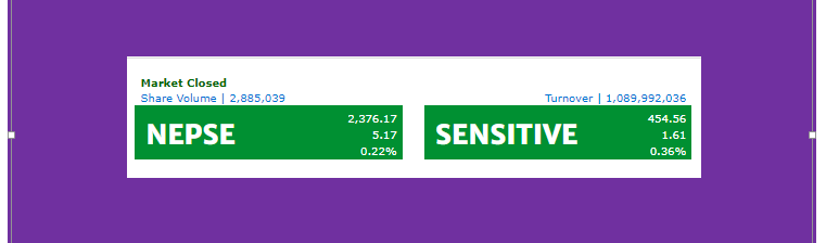 बुधबार नेप्से परिसूचक ५.१७ अंक बढेर २३७६.१७ विन्दुमा बन्द भएको छ। त्यसैगरी, यस दिन सेन्सेटिभ इण्डेक्स १.६१ अंक बढेको छ भने फ्लोट इण्डेक्स ०.२७ अंक र सेन्सेटिभ फ्लोट इण्डेक्स ०.३५ अंक बढेको छ।