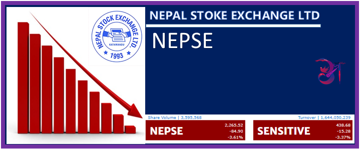 आइतबार सार्वजनिक बिदा दिने सरकारको निर्णय र सोमबार बुद्ध जयन्तिको बिदाले गर्दा आज मंगलबार खुलेको सेयर बजारमा भारी गिरावट देखिएको छ । मंगलबार बजार परिसूचक नेप्से ३.६१ प्रतिशतको उच्च गिरावट हुँदा नेप्से पुनः २२ सय अंकको बिन्दुमा झरेको छ । आज नेप्से ८४.९० अंकले गिरावट भएर २२६५.५२ अंकमा बन्द भएको छ ।