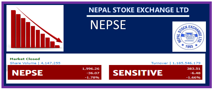 काठमाडौं – मंगलबार शेयर बजारले २ हजारको मनोवैज्ञानिक विन्दुलाई पनि छाडेर तल झरेको छ । अब नेप्से १९ सयको लेबलमा झरेको छ । नेप्से सूचक ३६.०७ अंकले घटेर १९९६.२६ विन्दुमा आएको हो । यसआधारमा अघिल्लो बुलको उच्चतम विन्दुभन्दा नेप्से करिब १ सय १५ अंकजति मात्र माथि छ । अघिल्लो बुलमा नेप्सेले १८८१ को उच्चतम विन्दु बनाएर त्यसपछि तल झरेको थियो । मंगलबार १ अर्ब १८ करोड रुपैयाँभन्दा बढीको सेयर कारोबार भएको छ ।