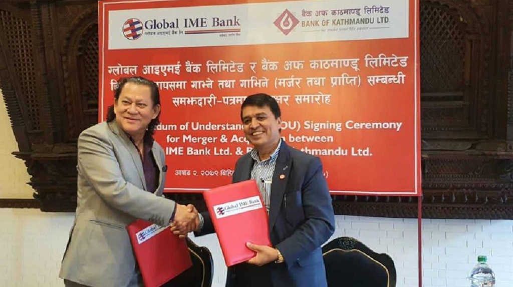 काठमाडौँ — ग्लोबल आईएमई बैंक र बैंक अफ काठमाण्डू बैंक (बीओके) आपसमा गाभिने भएका छन् । गाभिनका लागि दुवै बैंकले बिहीबार समझदारी पत्रमा हस्ताक्षर (एमओयू) गरेका छन् ।