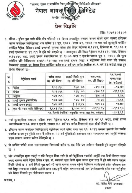यस्तै डिजलमा अब प्रतिलिटर ३७ रुपैयाँ १६ पैसा र एलपी ग्यासमा प्रतिसिलिन्डर सात सय ५१ रुपैयाँ १४ पैसा घाटा हुने निगमले जनाएको छ ।