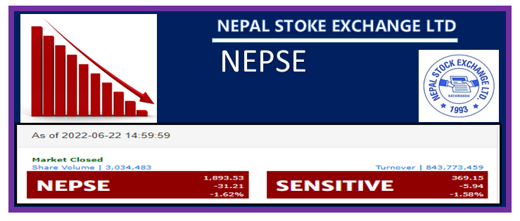 काठमाडौं – बुधबार बजार परिसूचक नेप्से ३१.२१ अंकले गिरावट भएर १८९३.५३ अंकमा बन्द भएको छ । नेप्सेसँगै सबै उपसूचकमा गिरावट भएको छ । हाइड्रोपावर, विकास बैंक, वित्त कम्पनी र अन्य उपसूचकमा साढे २ प्रतिशतभन्दा माथिको गिरावट भएको छ ।
