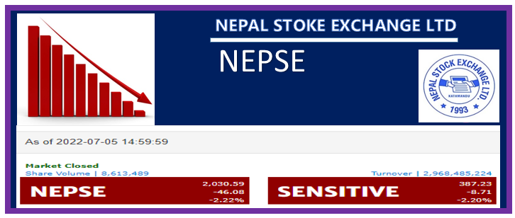 काठमाडौं- साताको कारोबारको तेश्रो दिन मंगलबार सेयर बजार घटेको छ। मंगलबार नेप्से परिसूचक ४६.०८ अंकले घटेर २ हजार ३०.५९ विन्दुमा पुगेको छ।