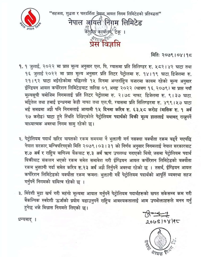 ‘पछिल्लो पटक प्राप्त नयाँ मूल्य सूचीले निगमलाई १५ दिनमा ६३ करोड ५८ लाख रुपैयाँ घाटा हुने स्थिति देखिएकाले पेट्रोलियम पदार्थको बिक्री मूल्य हाललाई यथावत् राख्नुपर्ने बाध्यात्मक अवस्था छ,’ विज्ञप्तिमा भनिएको छ।