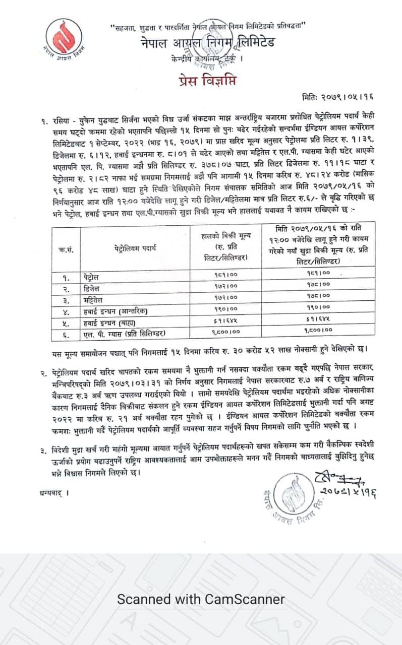 त्यस बेला खुद्रा बिक्री मूल्य यथावत् राखेको निगमले भाउ बढेर आएलगत्तै बिहीबार राति १२ बजेदेखि लागू हुने गरी डिजेल र मट्टीतेलको मूल्य ६र६ रुपैयाँले बढाएको हो ।