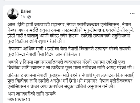 आज देखि हामी काठमाडौ महानगर ,नेपाल फ्लोरीकल्चयर एसोसिएसन , नेपाल चेम्बर अफ कमर्सले सयुक्त रुपमा काठमाडौको भृकुटीमण्डप, एयरपोर्ट–तीनकुने, हाँडी गाउँ र बालाजु भ्याली कोल्ड स्टोर छेउमा स्वदेशी उत्पादनको सहुलियतमा फूल विक्रीका लागि खुला गरेको छौ ।नेपालमा आर्थिक मन्दी भइरहेका बेला नेपाली किसानले उत्पादन गरेको सयपत्री फूल किन्दा नेपाली पैसा विदेश जान रोकिनेछ ।
